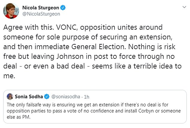 随即,苏格兰民族党(SNP)领导人尼古拉·斯特金也在推文中积极回应:“同意这一点,没有什么事情是毫无风险的,但是让鲍里斯继续留在首相的位置上,强行无协议脱欧或者达成一笔不妥的协议,这对我来说都是糟糕的选项。”