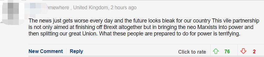 有英国民众说道:“消息一天比一天糟,我们国家的未来看起来很暗淡。SNP和工党这种卑鄙的伙伴关系不仅旨在彻底结束英国脱欧,更是为了让科尔宾掌权,甚至不惜分裂我们伟大的联合王国。这些人为权力所做的事情是可怕的。”