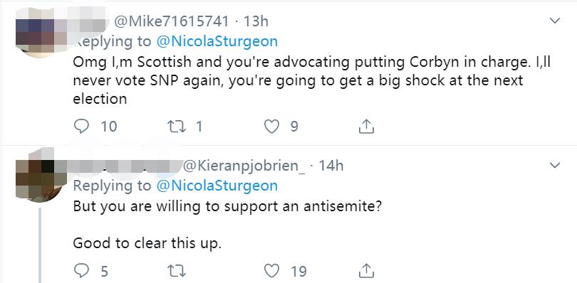 甚至原本支持SNP的苏格兰人也对此深感愤怒:“天哪,我是苏格兰人,你主张让科尔宾掌权。我不会再投苏格兰民族党了,下次选举你会大吃一惊的。”