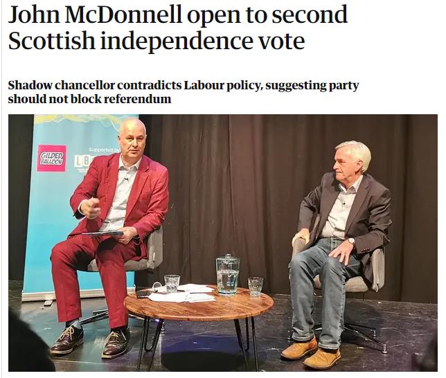 当时,工党影子大臣约翰•麦克唐奈(John McDonnell)就曾明确表示,工党不会阻止苏格兰民族党举行第二轮独立公投。