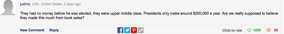 “在他当选总统之前,他们根本就没那么多钱,只是中上层阶级。而总统的年薪只有20万美元左右,真的该相信他们从图书销售中赚了这么多钱吗?”