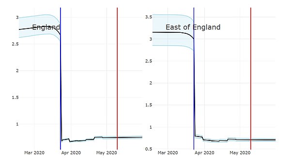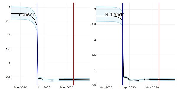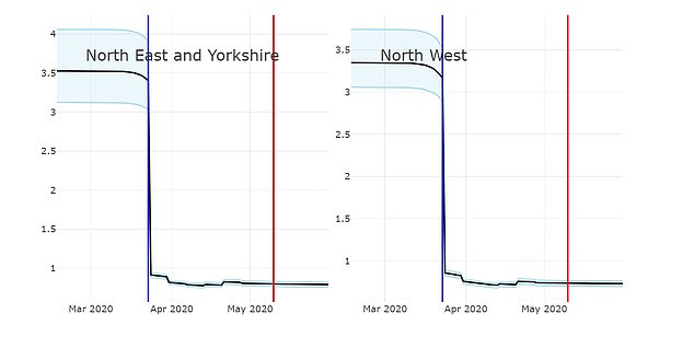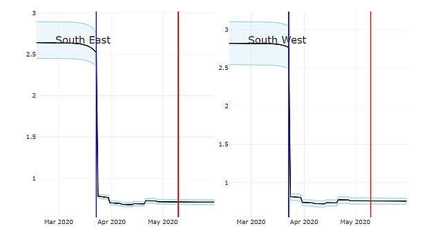 如下图所示,展示了英格兰各地区自“封锁”措施实行以来,R值的下降情况。