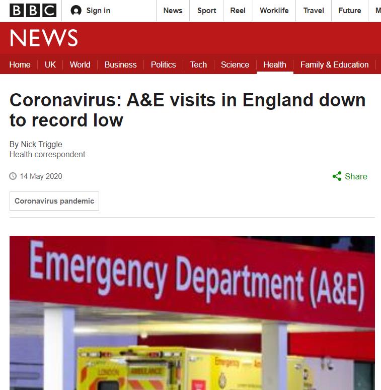 此前,英国各大急诊室就诊每月大约有210多万名就诊患者,而在今年3月,这一数字降至了153万,在4月份,就诊人数更是降到了91万人,是自2010年有记录以来的最低水平。