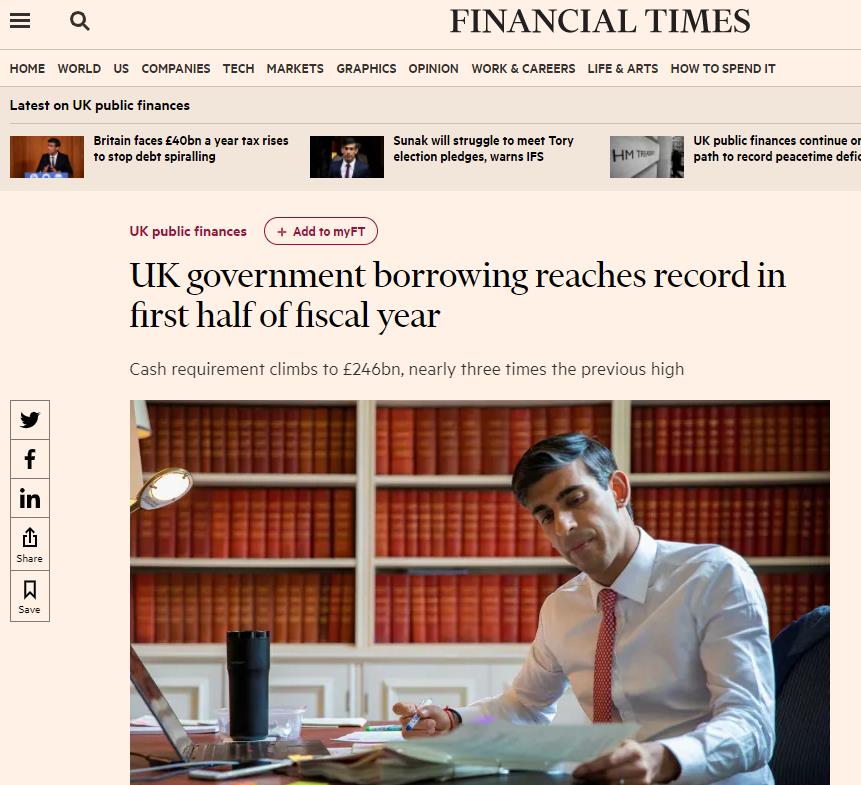 尽管政府借款低于英国预算责任办公室OBR的预测,但自4月份以来,英国的债务总额增加了2,085亿英镑,比去年同期多出1,745亿英镑,几乎是去年全年的四倍。