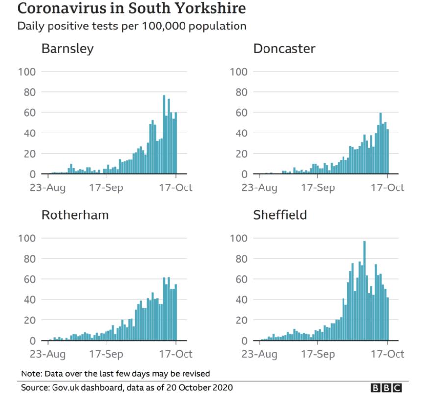 英国政府表示,之所以对当地实施限制措施,是因为南约克郡的新冠感染率一直居高不下,在截至10月17日的一周内,Doncaster的感染率为每10万人中确诊316例,Rotherham为每10万人中确诊370例,Sheffield为395例,Barnsley为415例。