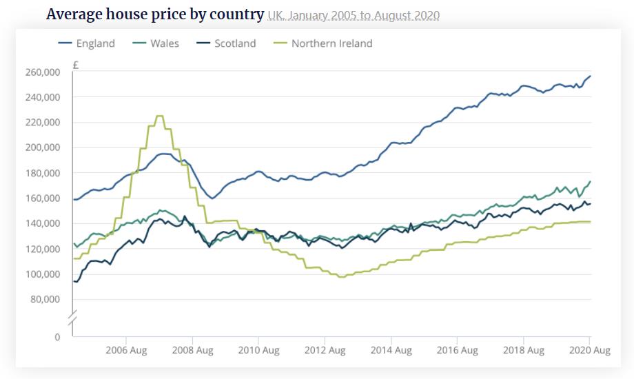 在过去的一年里,英格兰的平均房价上涨了2.8%,达到25.6万英镑,威尔士上涨了2.7%,达到了17.3万英镑,苏格兰上涨了0.6%至15.5万英镑,北爱尔兰上涨了3.0%至14.1万英镑。