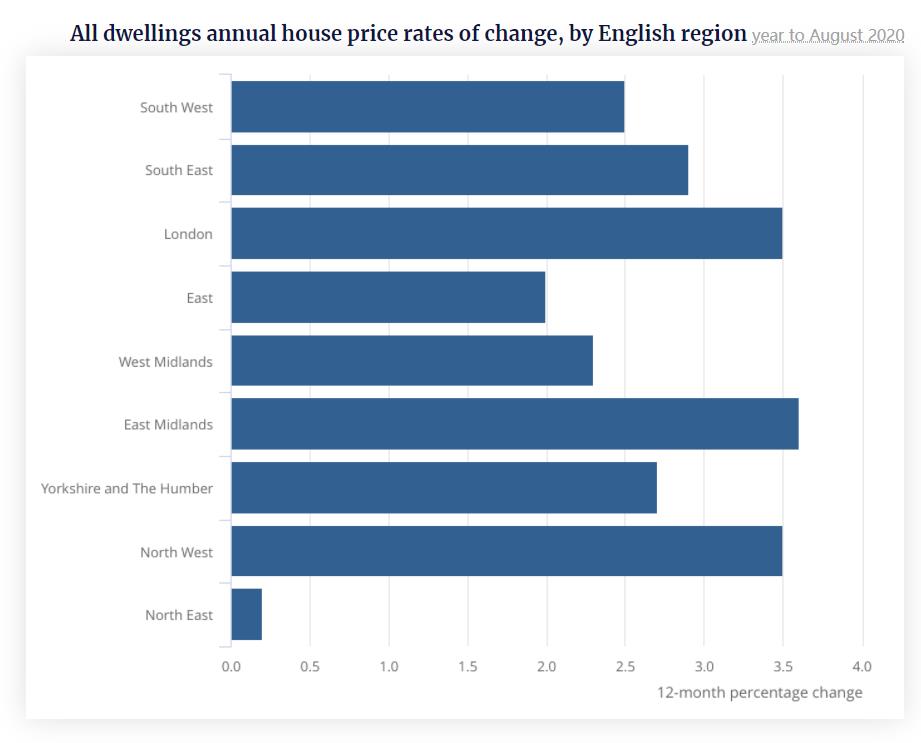 在英格兰地区,东米德兰兹和伦敦的年度房价涨幅最高,伦敦年增长率高达3.5%。