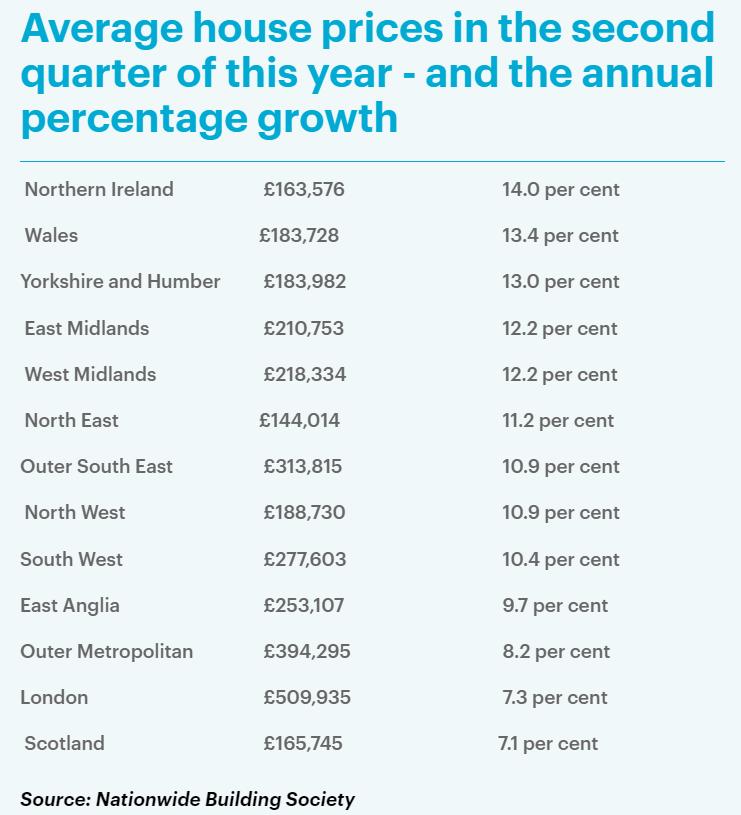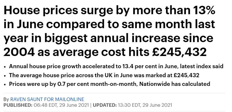 Nationwide的数据显示,今年6月份英国房价的年增长率达到了13.4%,这是自2004年11月以来的最高涨幅,目前均价已经达到了245,432英镑,较去年同期增加了近3万。