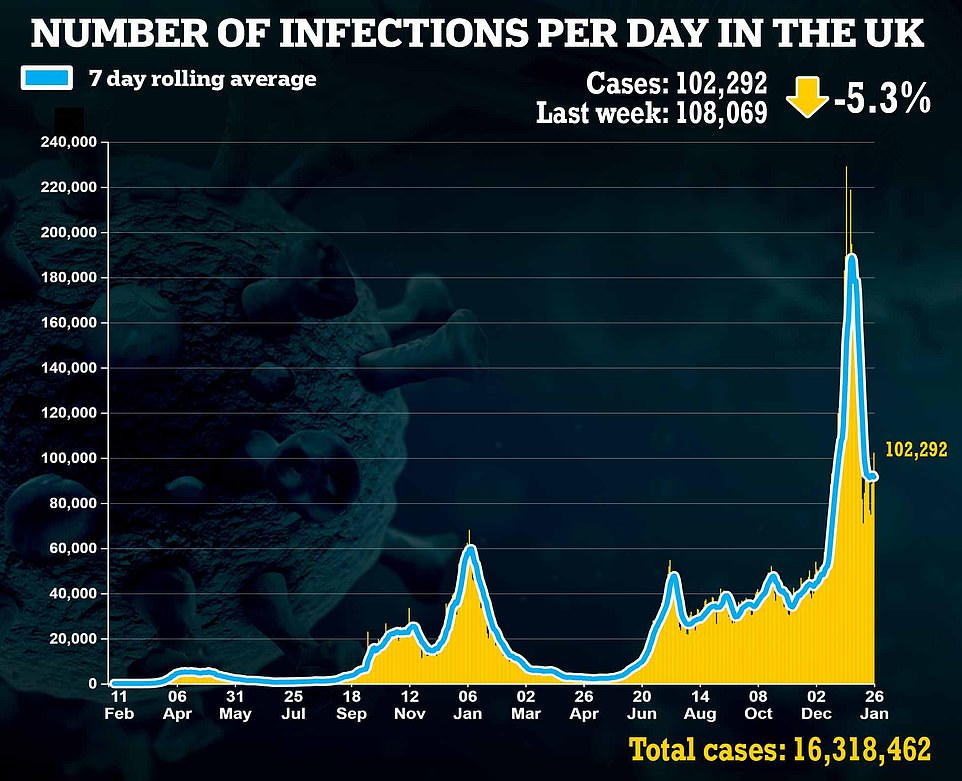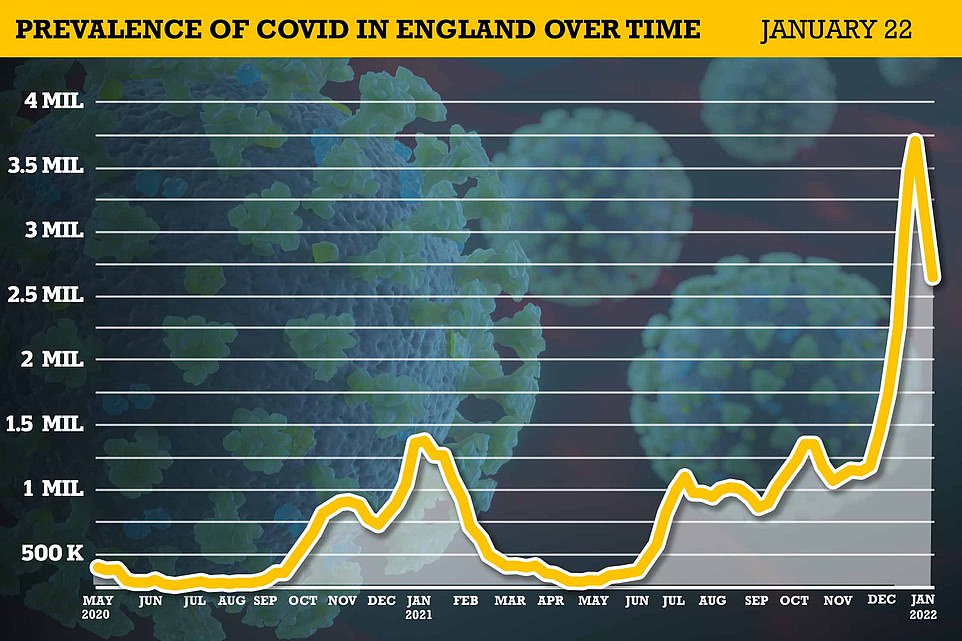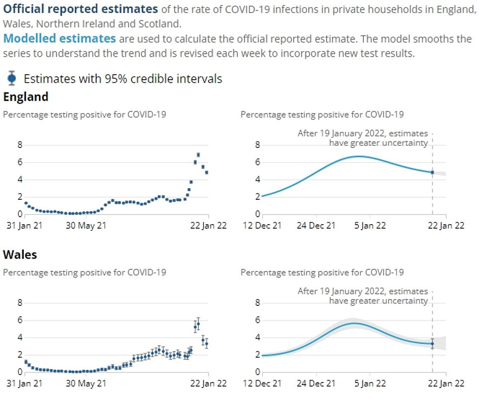 分析人士估计,在截至1月22日的一周内,感染人数在260万,之前的一周,为290万。这些数据意味着,英格兰每20个人中,就有1人感染了。